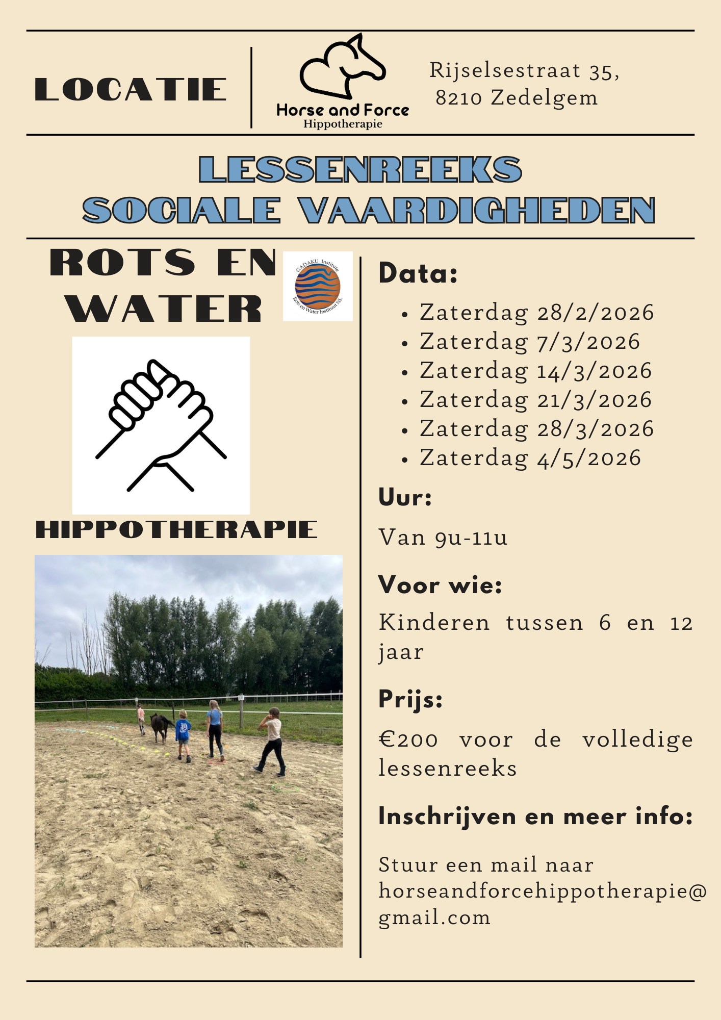 Verbeter jouw sociale vaardigheden samen met anderen tijdens een groepssessie met paarden. Leer de invloed van jezelf en anderen herkennen met behulp van de interactie met paarden. Dit samen met de methodiek van Rots en water.